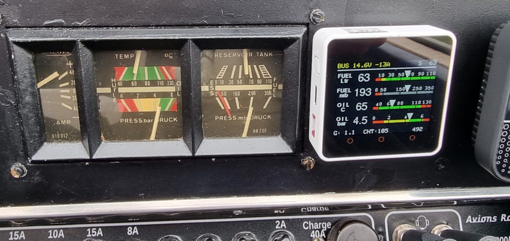 Next – does it agree with the actual aircraft meter? You cannot place the gauges in parallel, because the sender and the meter produce a potential divider, so putting two meters in parallel would halve its impedance and change the reading. Since my actual gauges may pack up at some point, its a good idea to see if they match now before that becomes an issue otherwise we’d be guessing. The answer is they agree within about 10%. So the fuel is reads 55 where as the plane reads 50, the others are in broad agreement. I didn’t check the ammeter because you can’t read either one sensibly – but you can check it on the bench and we already know its acceptable. We have used a calibrated thermocouple on the aircraft and the oil temp gauge is pretty close at 60C. For the fuel, when its showing about 60L and we brim the tank we get just under 60L of fuel in, and since the tank is 118L that shows its also reasonable.