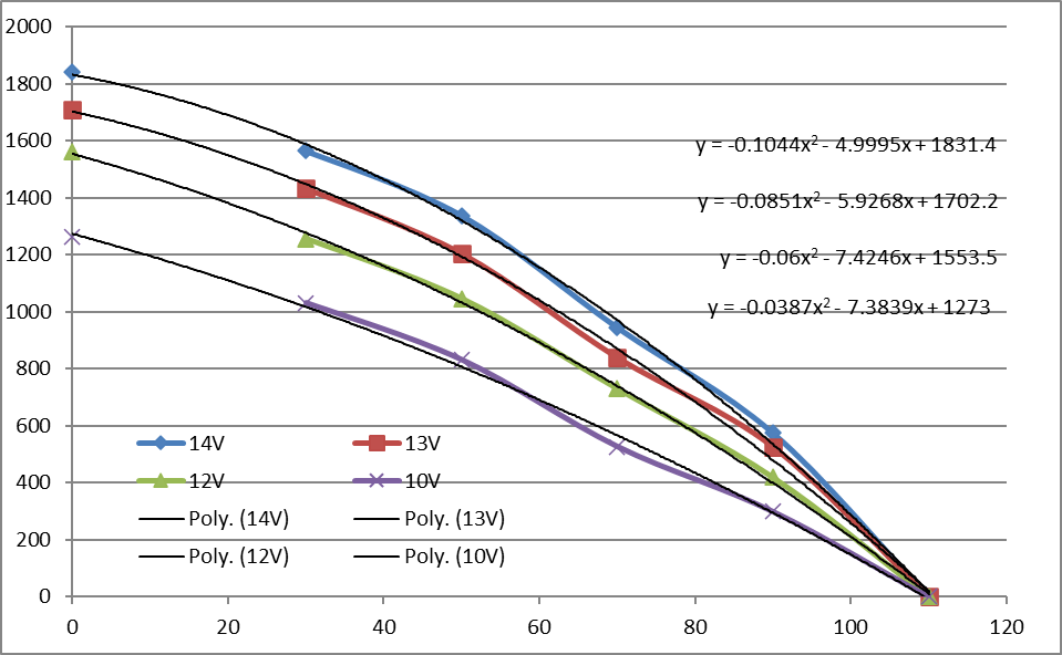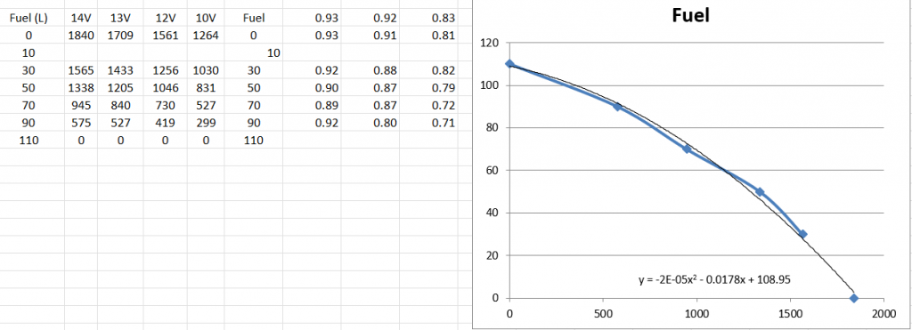 The reading is non-linear but remember that the sender is in parallel with half of the meter coils so that is of the form you’d expect. Using Excel we can get the formula for an approximation line form the actual values which results in over-reading at the higher fuel readings and under reads at the low end. That is definitely the way you want a Gauge!
